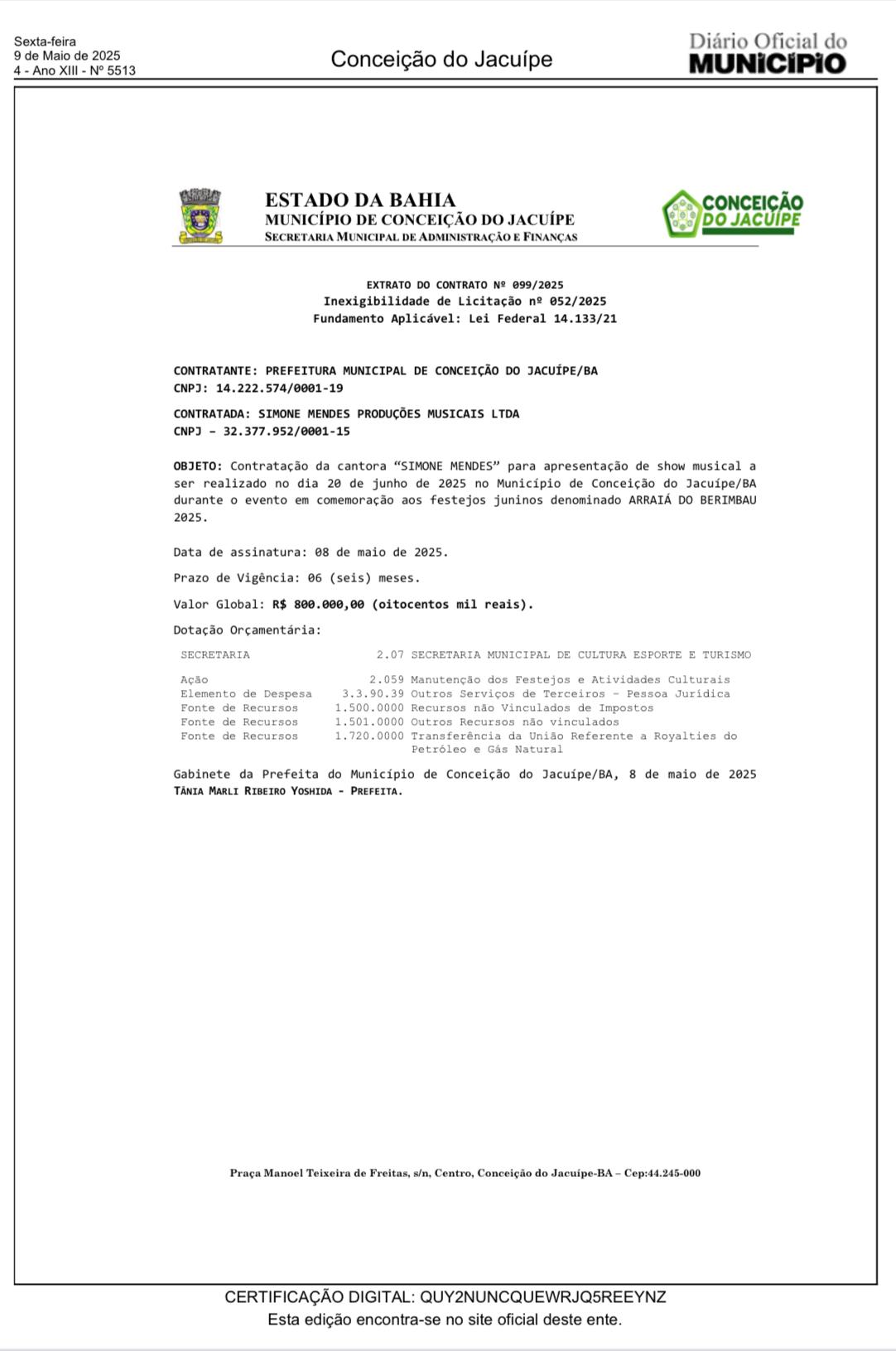De acordo com o contrato assinado no dia 8 de maio e publicado no diário oficial dos municípios, o show da cantora Simone Mendes custará aos cofres do município de Conceição do Jacuípe R$800 mil.